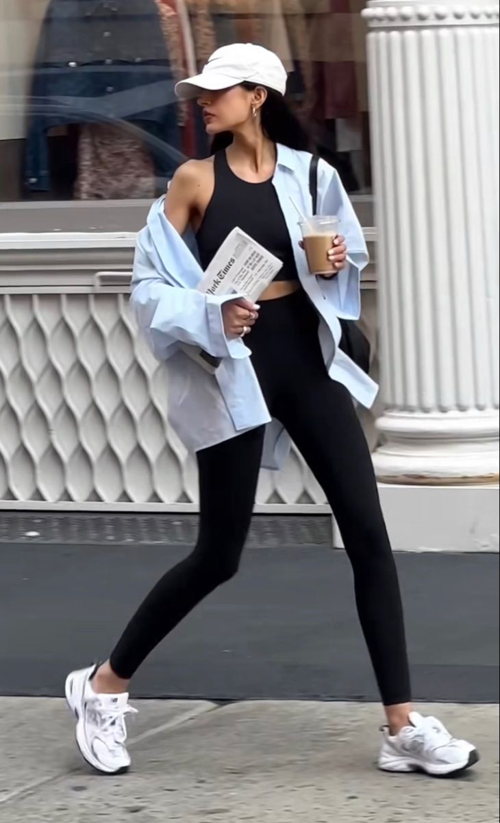 Ova kombinacija se oslanja na kvalitetne helanke visokog struka uparene sa oversajz lanenom košuljom ili oversize pamučnom majicom, što pruža maksimalnu slobodu pokreta uz zadržavanje doze elegancije.