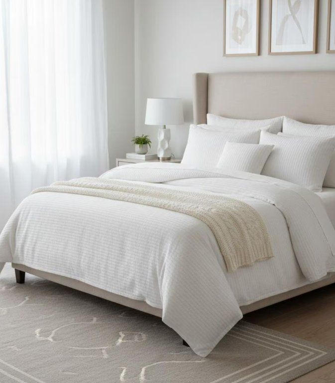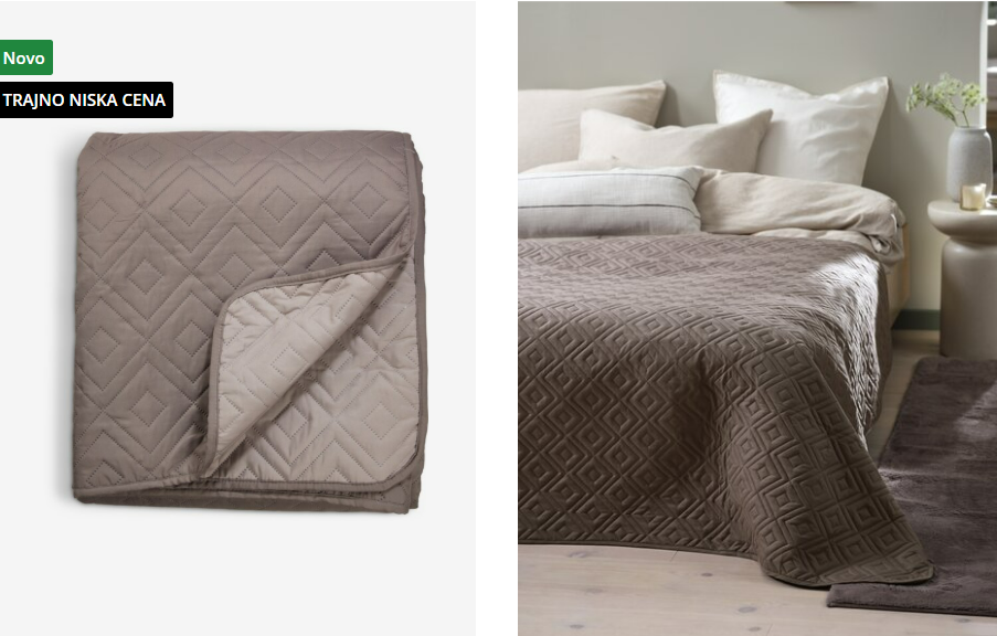 Prekrivač (Štepani ili Pleteni): Ovo ide preko donjeg dela kreveta. Birajte kontrastnu boju. Ako je posteljina bela, neka prekrivač bude sivi, tamno zeleni ili kamel braon.