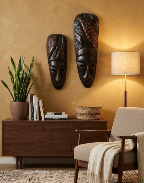 Živimo u eri "toplog minimalizma". Zamislite čist, beli zid. Zamislite modernu, nisku sofu od svetlog lana. A onda, iznad nje – Guro maska od tamnog, starog drveta.
