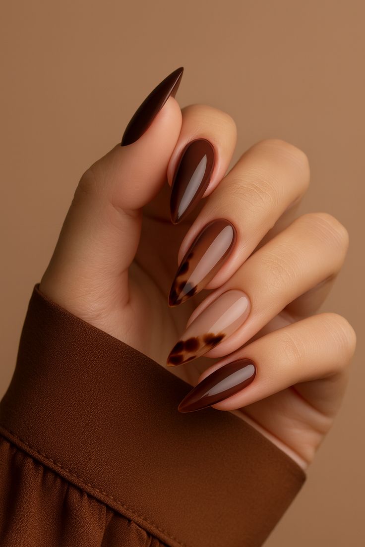 Svi nokti u kornjačevina dezenu. Ovo je statement izgled. Izgleda moćno, pomalo retro, i savršeno se uklapa u trenutne modne trendove koji slave braon tonove i životinjske printove.